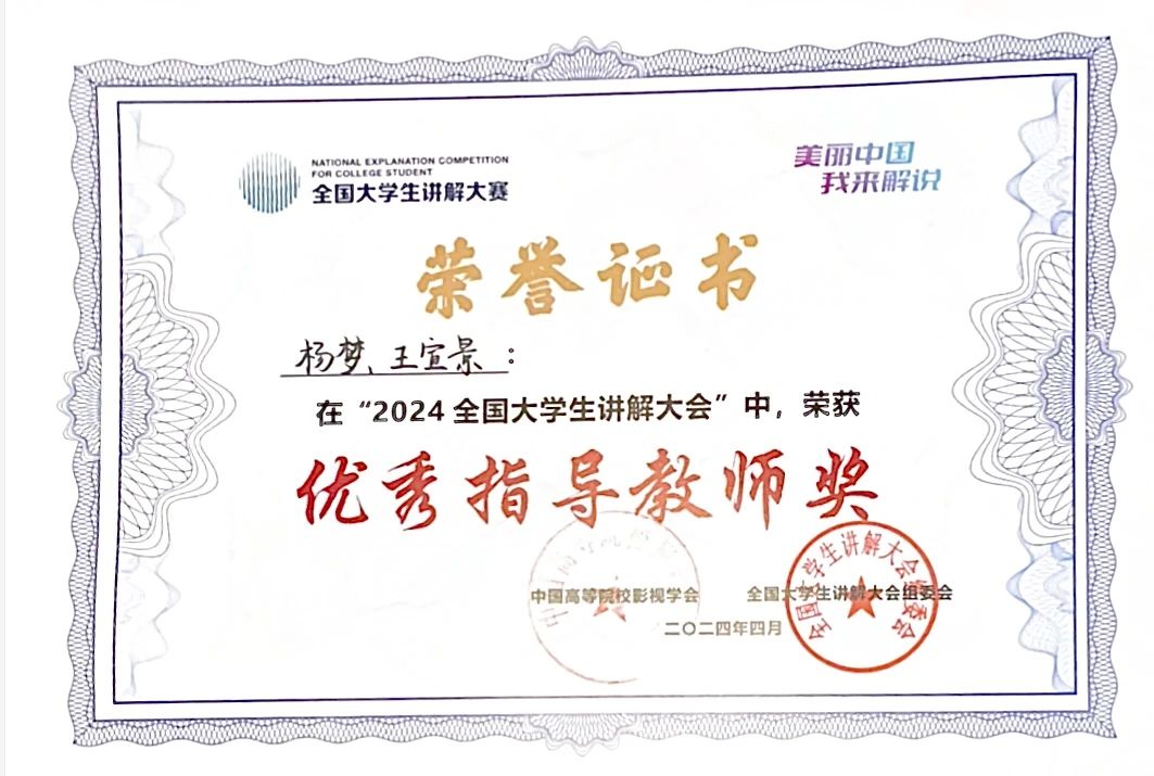 本次比赛共收到了来自全国31个省、自治区、直辖市和新疆生产建设兵团的230所高校提交的1791部作品。其中,yl7703永利集团舒希媛同学荣获文旅赛道优秀奖,yl7703永利集团教师杨梦、王宣景老师荣获优秀指导教师奖。