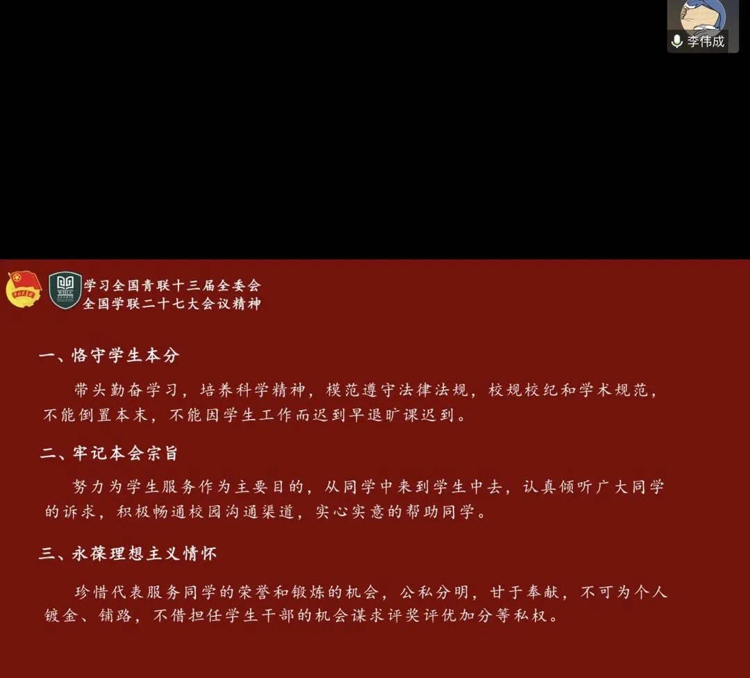 最后是校团委副书记李伟成老师的发言,他首先强调与总结了全国青联十三届全委会、全国学联二十七大精神。他强调,要让责任长立心尖。要求真务实,团委工作本质上是服务群众的工作,理应贴近群众,切勿脱离现实。他也提出了学生干部自律公约,分为以下恪守学生本分、牢记本会宗旨、永葆理想主义情怀、扎扎实实做事、营造平等氛围、摒弃庸俗习气六点,他提醒同学们应该思考新时代的发展问题。