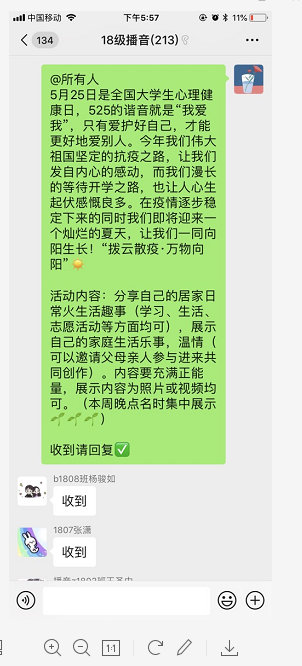 2020年新冠肺炎疫情猝不及防地席卷了全国,也裹挟了我们每一个人。面对疫情,2018级的同学们已经有了很多科学的防范措施,在身体修筑了一道道防火墙,这些“防火墙”可以保证身体远离病毒,但同学们的心理却仍时刻暴露于疫情之下。为了加强心理健康教育,提升学生思想道德素质和心理健康成长,帮助同学们找到自己调节情绪和缓解压力的方法,5月17日播音学院辅导员易巧玲老师带领2018级的同学们开展了线上“525心理健康活动”,此次活动的主题为“录‘疫’时刻”。
