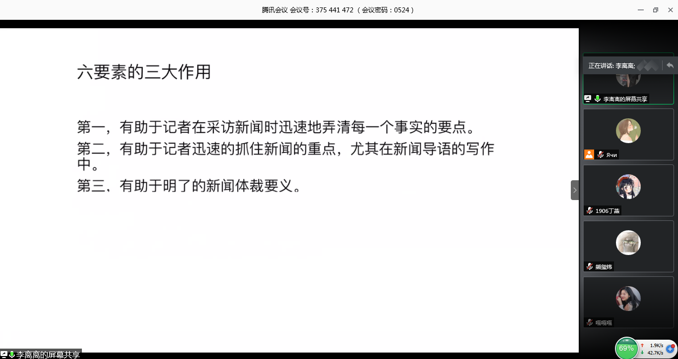 会议开始,李离离同学先带领同学们简单了解了新闻稿的组成和特点,介绍了“5W和1H”的六要素,使同学们对于新闻稿有了相对基础的了解。