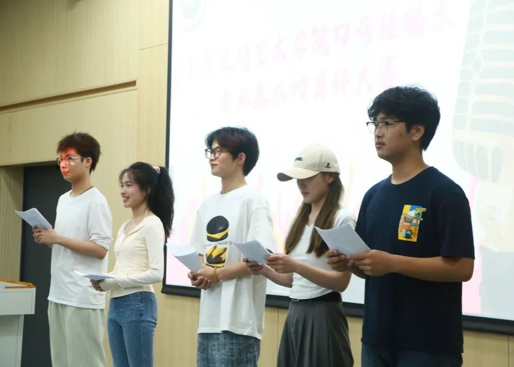 在随机内容考核环节,由评委随机指定小组成员进行考核,现场抽题,在1分钟准备后,立即开启考核。考核内容涵盖绕口令、新闻播报、易错字音辨析和朗诵选段;每每考核题目出现后,现场观众也都随即主动开始练习,充分展现了口语传播系同学们的专业热情。每当同学考核通过,现场掌声雷动,久久不息。