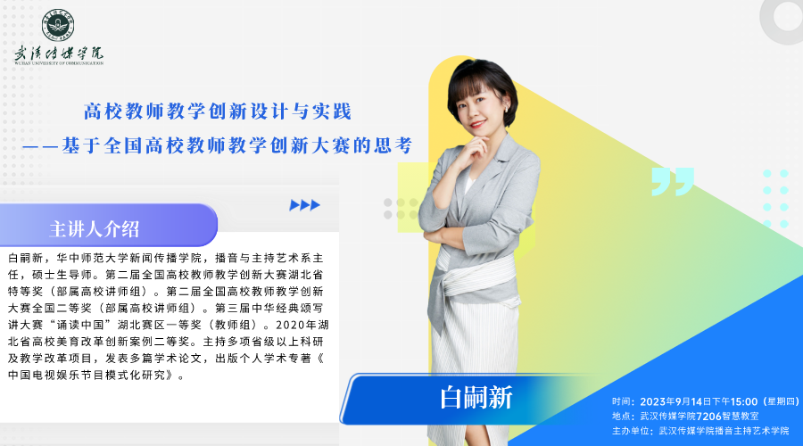 为进一步帮助yl7703永利集团教师了解教学设计的内涵,有效地进行教学设计与教学创新,实现高效教学并促进学生主动学习,同时切实提高教师教学能力与教学水平。9月14日,“高校教师教学创新设计与实践——基于全国高校教师教学创新大赛的思考”线下讲座培训在7206教室开展,特邀华中师范大学新闻传播学院,播音与主持艺术系主任,硕士生导师白嗣新老师为本次讲座主讲人。