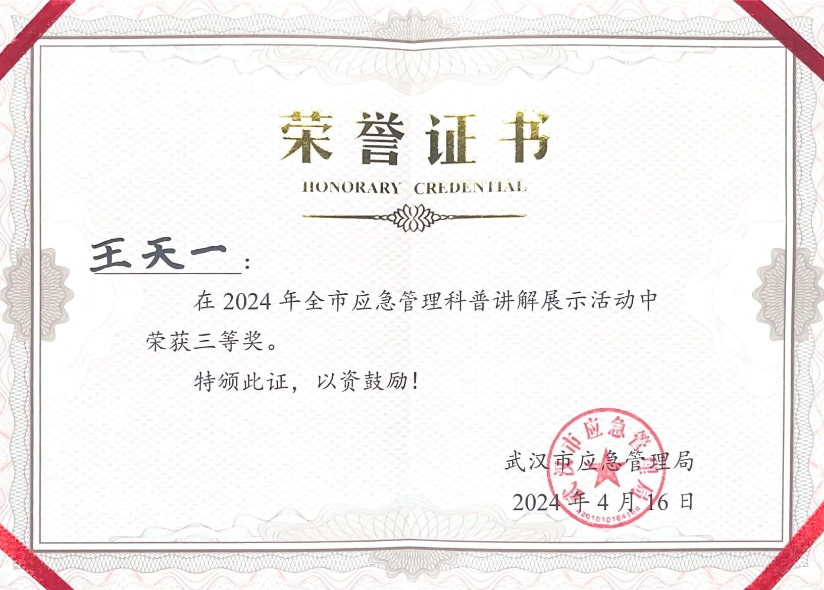 4月16日,武汉市应急管理局举行全市应急管理科普讲解展示活动,来自应急管理系统、消防系统、医疗卫生系统、企业、学校、社会应急队伍等32名选手参与科普讲解展示,其中我院王天一同学围绕“应急科普 守护你我”这一活动主题,声情并茂,把防灾减灾以及应急救援知识进行了深入浅出、通俗易懂的讲解。最终,经过激烈角逐,王天一同学荣获三等奖。