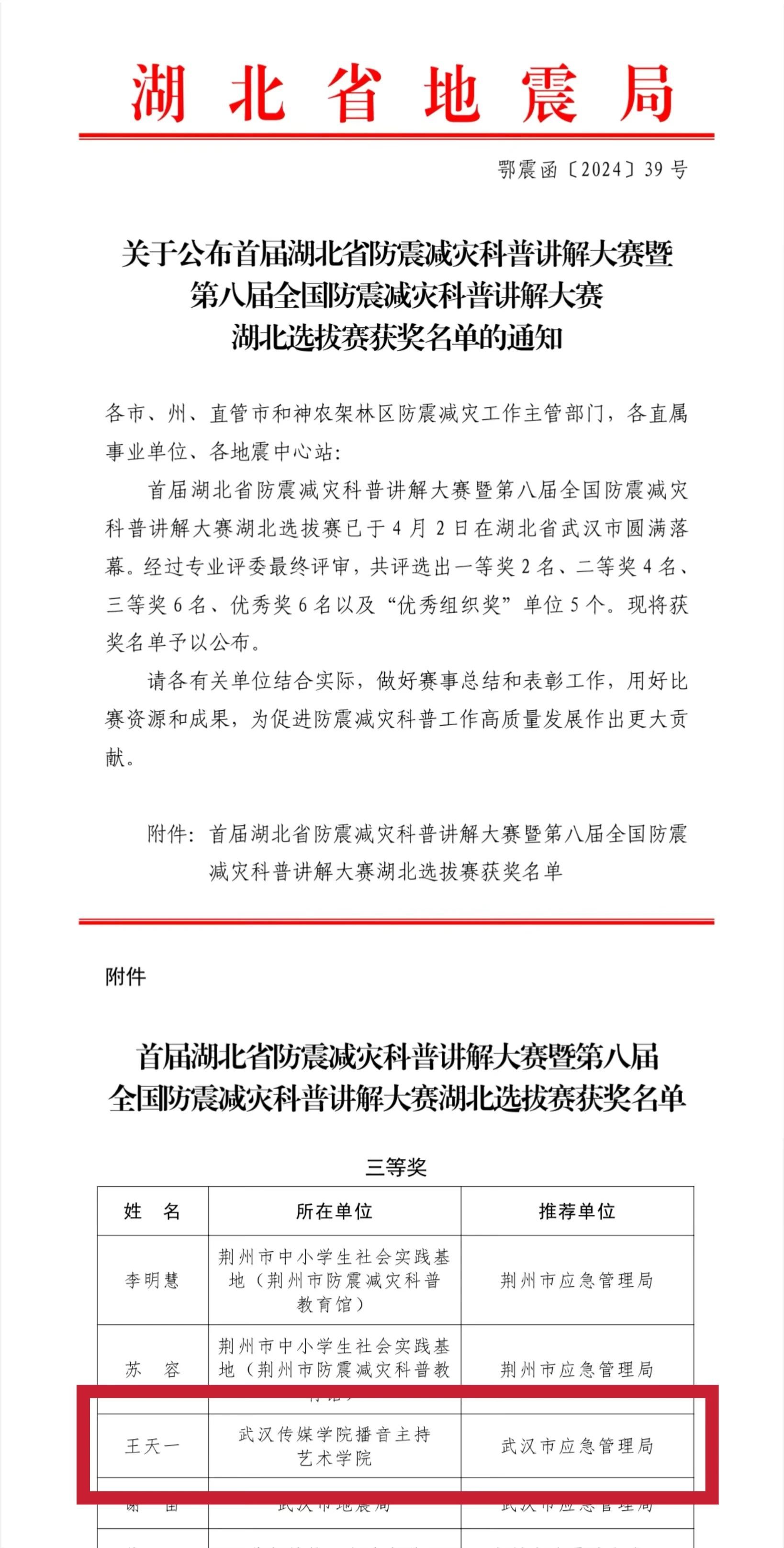 2024年4月2日,湖北省防震减灾科普讲解大赛暨第八届全国防震减灾科普讲解大赛湖北省选拔赛在武汉成功举办。我院王天一同学围绕“防震减灾,科普先行”主题,聚焦震后救援、自救互救、地震预警等话题,通过生动有趣的讲解,最终荣获省三等奖。