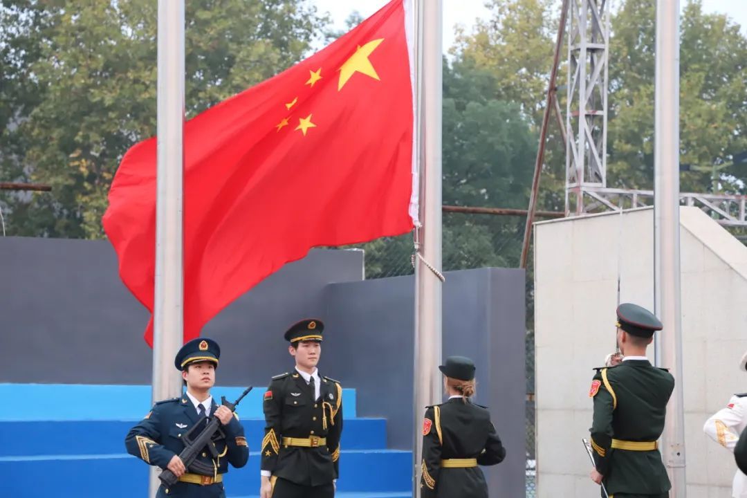 晨辉盎然,升旗仪式正式开始,国旗护卫队迈着整齐而铿锵有力的步伐,护卫着国旗走向升旗台。五星红旗缓缓升起,全场师生肃立向国旗致以崇高的敬意。