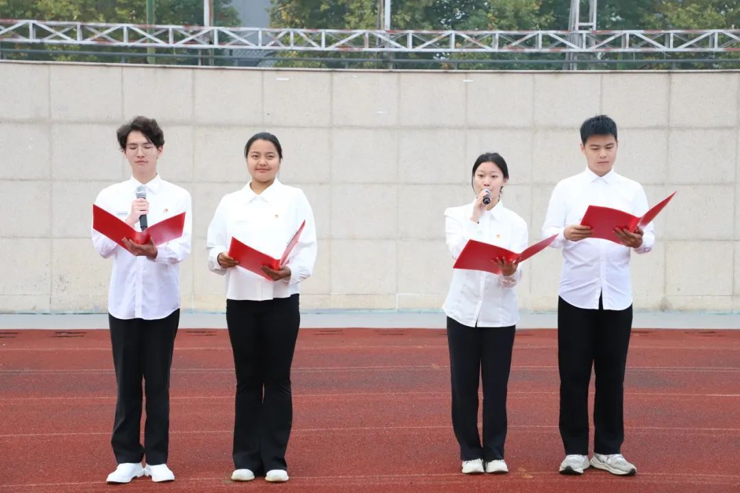 学生代表杨政晔、边雨璇、廖鑫、郭紫祯同学朗诵诗歌《丹青染就七十五,少年共谱中华图》,献礼中华人民共和国成立七十五周年。