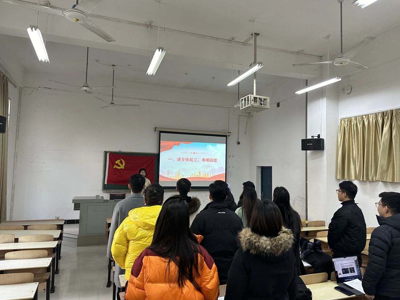 会议第一项,全体起立,唱国歌。