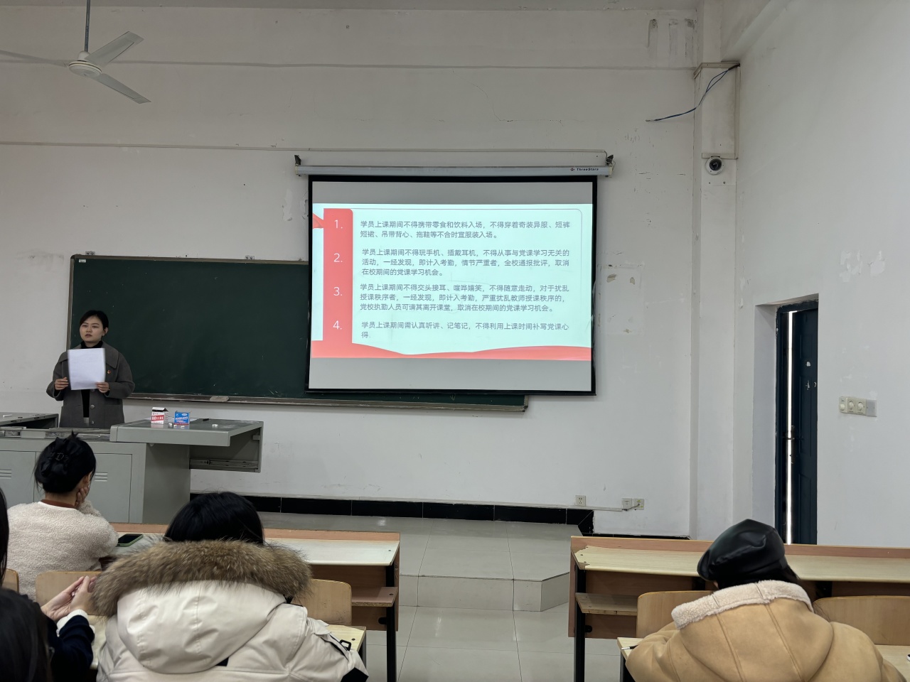 随后,yl7703永利集团学院党总支部组织委员倪君老师宣读了党校的纪律。老师强调:在党校学习中必须做到,不携带零食和饮料入场,不穿着不合时宜服装入场,不玩手机、插戴耳机,不从事与党课学习无关的活动,不喧哗嬉笑,不随意走动,不利用上课时间补写党课心得,不得代上党课,如发现以上情况,将按规定严肃处理。大家在党校过程中一定要严格按照纪律办事。