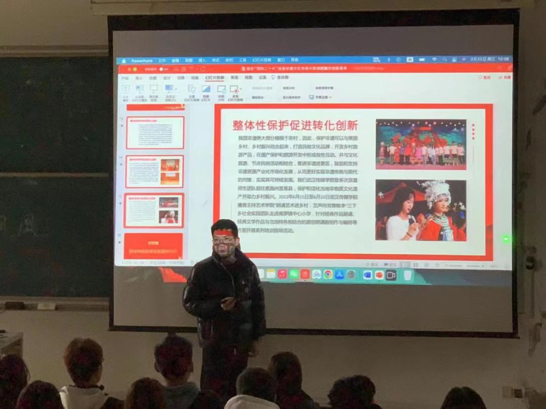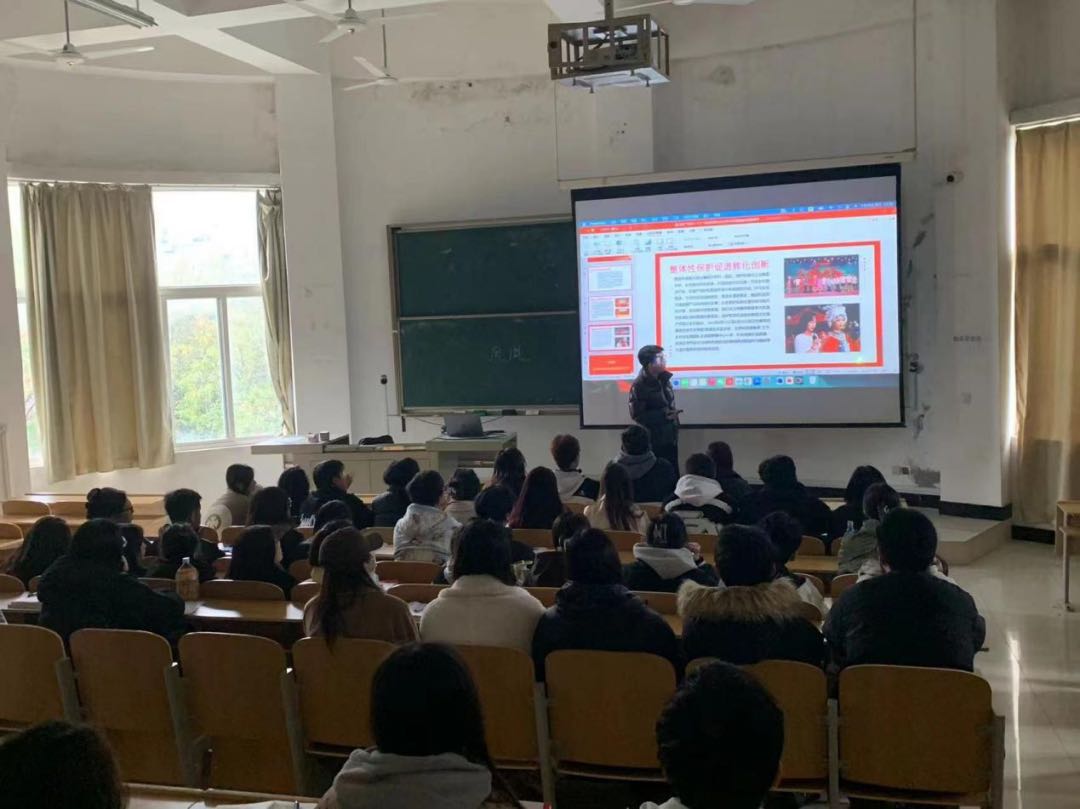 党课的最后,胡桐同志讲到,非物质文化遗产是中华民族数千年来的智慧积淀,是中国传统文化中的璀璨明星。创新传承非遗文化,既是乡村振兴的基本目标,又是乡村振兴的精神内核,更是乡村振兴可持续发展的软实力。“以美育人,以文化人”,依托艺术和文化使乡村振兴更加坚定,塑造文化自信,有效激活优秀传统文化,助推文化产业赋能乡村振兴。我们要创新传承方式,通过朗诵、舞蹈等元素,呈现传统与现代的完美结合,逐渐形成并完善“教-学-传”体系,立德树人、以文化人,让冷门的非遗文化“热”起来!