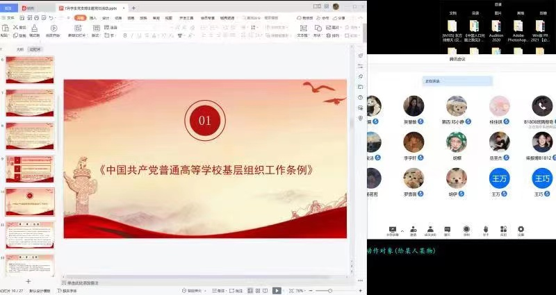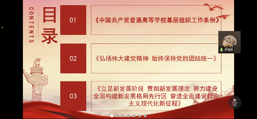 会议中,罗雪薇同志带领大家学习了《中国共产党普通高等学校基层组织工作条例》、《弘扬伟大建党精神 始终保持党的团结统一》、《立足新发展阶段 贯彻新发展理念 努力建设全国构建新发展格局先行区 奋进全面建设社会主义现代化国家新征程》的主要内容。