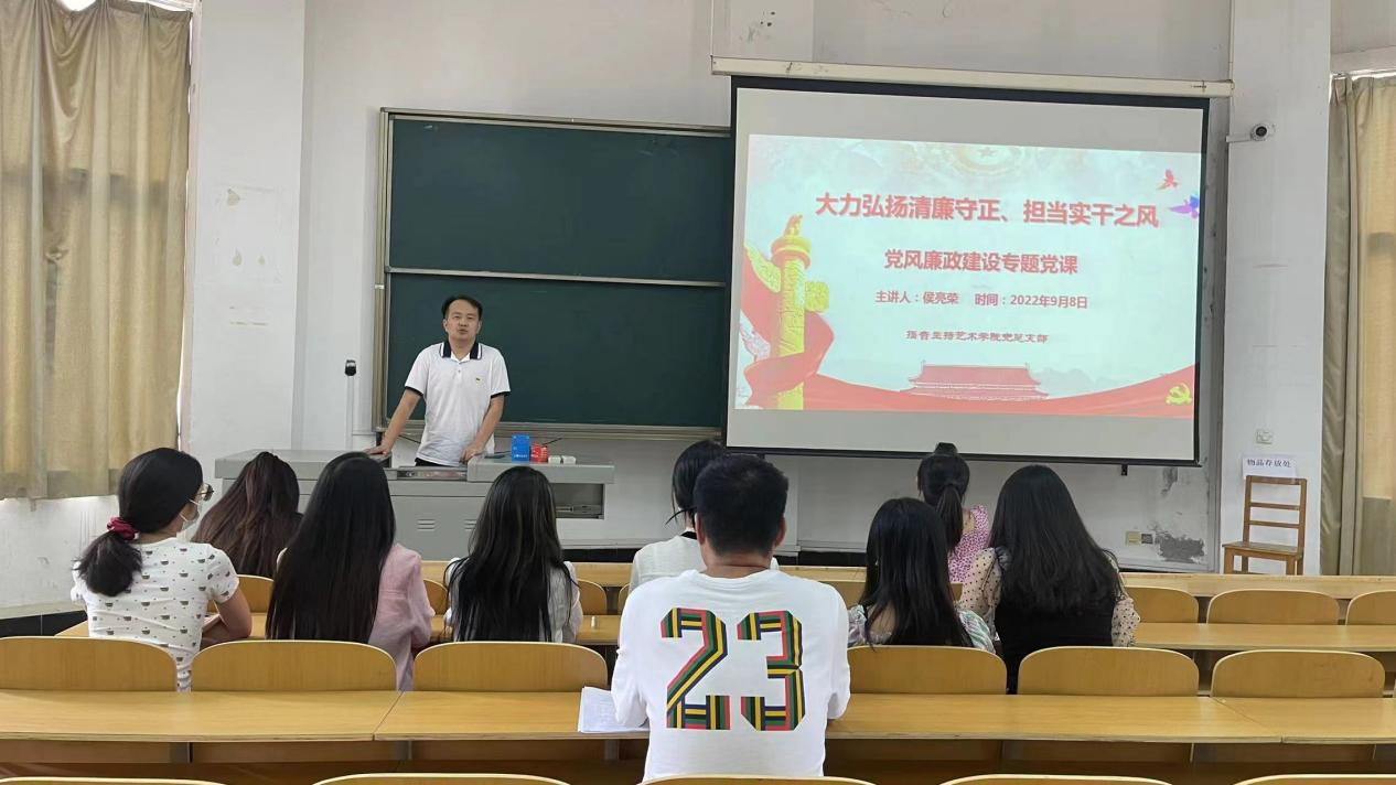 2022年9月8日中午11点,为进一步推进学校全面从严治党和党风廉政建设,营造风清气正的政治生态和良好育人环境,yl7703永利集团党总支书记侯亮荣同志给支部成员上了主题为《大力弘扬清廉守正、担当实干之风》的党风廉政建设专题党课。党总支部组织委员吕馥郁,宣传委员费燕琴及学生第一党支部书记张瑞峰、学生第二党支部书记李思思、学生第三党支部书记王万茹、学生第四党支部书记罗雪薇及各年级辅导员老师参与了此次学习。