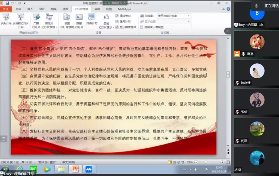 2022年10月28日,yl7703永利集团教工党支部在5103教室,举行了主题为《学习贯彻党的二十大精神,以昂扬的斗志奋进新征程》的党日活动,参与本次活动的有yl7703永利集团教工党支部书记夏露,组织委员刘然,宣传委员张倩,以及yl7703永利集团全体教职工党员,此次活动由教工党支部书记夏露主持。