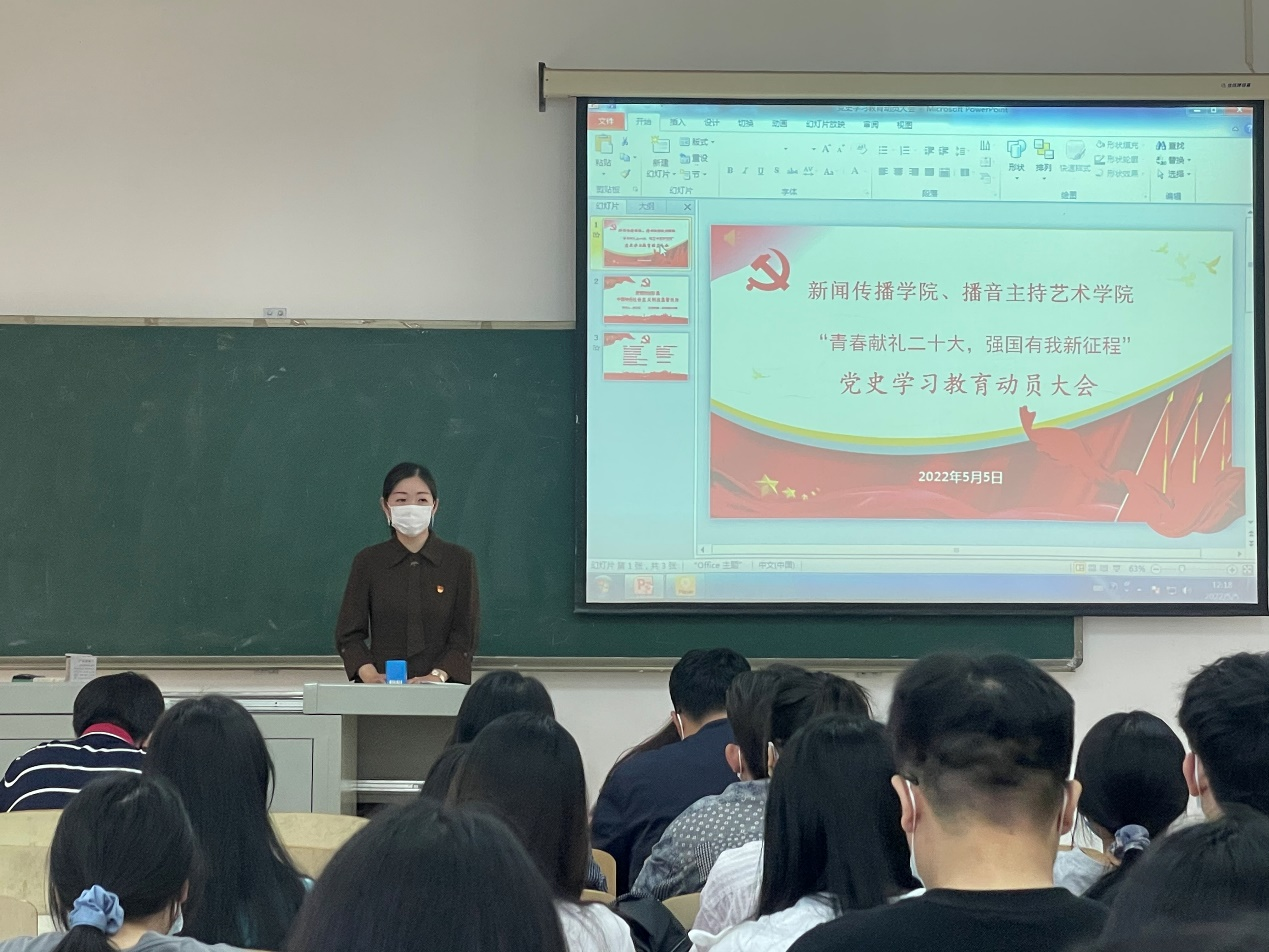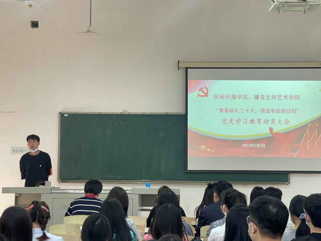 为深入学习贯彻习近平总书记关于党史学习教育的重要指示精神,持续巩固拓展深化党史学习教育成果。5月5日中午12;00,yl7703永利集团党总支部在3205教室召开了“青春献礼二十大、强国有我新征程”党史学习教育动员大会,参加本次大会的有yl7703永利集团、新闻传播学院党总支部书记侯亮荣同志,yl7703永利集团党支部组织委员吕馥郁同志,党总支部宣传委员费燕琴同志,学生第一党支部书记张瑞峰同志、学生第二党支部书记李思思同志、学生第三党支部书记王万茹同志、学生第四党支部书记罗雪薇同志以及各支部全体党员、春季发展对象。2022年春季发展对象也参与了本次大会,本次大会由新闻传播学院党总支部组织委员蒋宇杰同志主持。