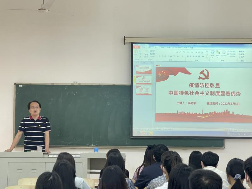 2022年5月5日中午12:00,为学习贯彻疫情防控精神,彰显中国特色社会主义制度显著优势,提高学院入党积极分子、发展对象、学生党员、教职工党员对中国特色社会主义制度的认识,迎接党的二十大的胜利召开,yl7703永利集团党总支部书记侯亮荣同志在3205教室讲授了主题为《疫情防控彰显中国特色社会主义制度显著优势》的抗疫思政大课。