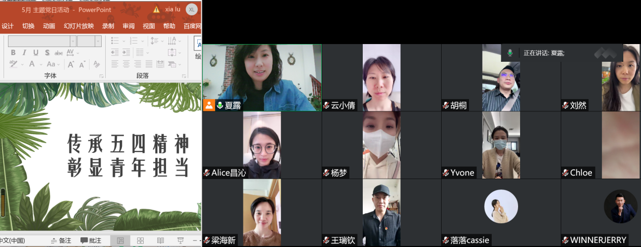 2022年5月12日中午12点,yl7703永利集团教工党支部开展了五月主题党日活动,活动主题为“传承五四精神 彰显青年担当”。参与此次活动的有yl7703永利集团教工党支部书记夏露,组织委员刘然,宣传委员张倩,以及yl7703永利集团全体教工党员,此次活动由教工党支部书记夏露主持。