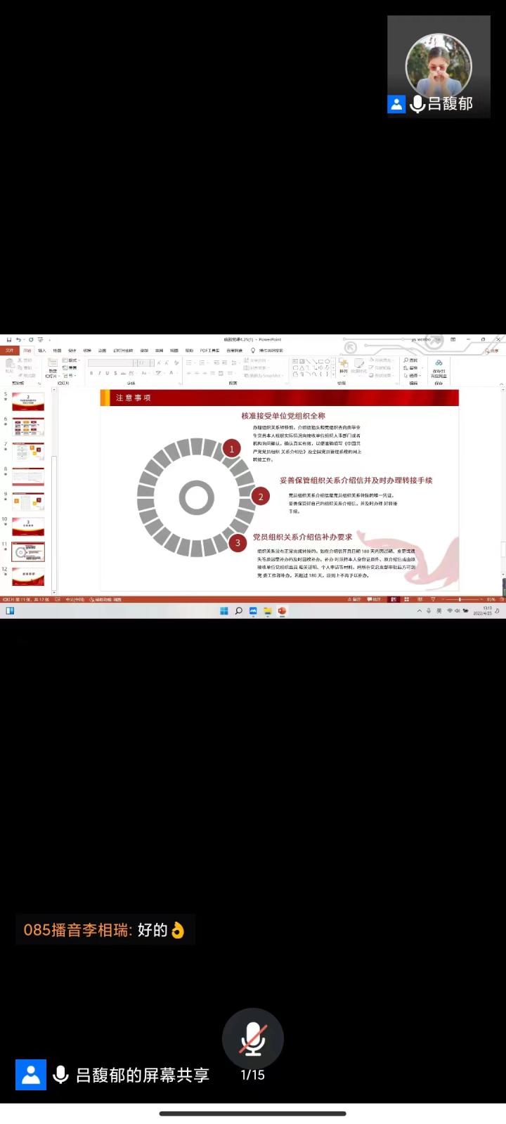 随后,吕馥郁为毕业生党员们详细讲解了组织关系转接工作流程和政策规定,并叮嘱每名毕业生党员应在规定时间内联系可以接收其党员组织关系的党组织,明确党组织的全称,协助各学生党支部书记准确填好《2022届毕业生党员组织关系介绍信登记表》,同时提醒了各位毕业生党员,无正当理由超过六个月未转接组织关系的,应视同自行脱党,毕业生党员的应高度重视。
