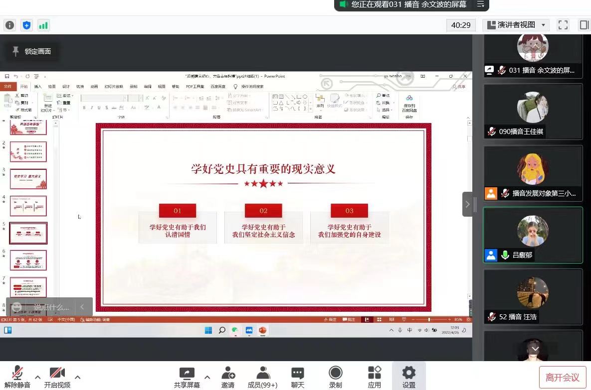 党课上,吕馥郁老师通过相关文献资料向学员们讲述了中国共产党的百年千秋伟业,从新民主主义革命时期、社会主义革命和建设时期到改革开放和社会主义现代化建设新时期,再到如今的新时代中国特色社会主义建设新时期。吕馥郁老师讲到:“新民主主义革命时期,党领导人民浴血奋战、百折不挠,创造了新民主主义革命的伟大成就,成立了中华人民共和国。社会主义革命和建设时期,党领导人民自力更生、发愤图强,创造了社会主义革命和建设的伟大成就,实现了中华民族有史以来最为广泛而深刻的社会变革,实现了一穷二白、人口众多的东方大国大步迈进社会主义社会的伟大飞跃。改革开放和社会主义现代化建设新时期,党领导人民解放思想、锐意进取,创造了改革开放和社会主义现代化建设的伟大成就。迈入中国特色社会主义新时代,开启全面建设社会主义现代化国家新征程”。