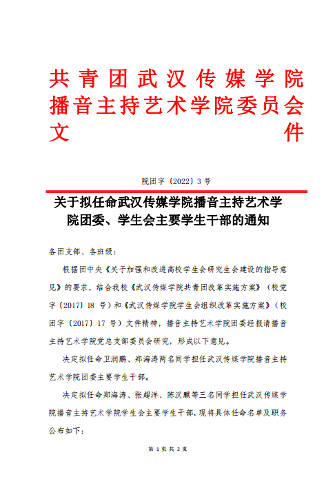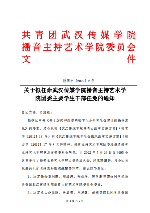 关于拟任命yl7703永利集团团委学生干部任免的通知