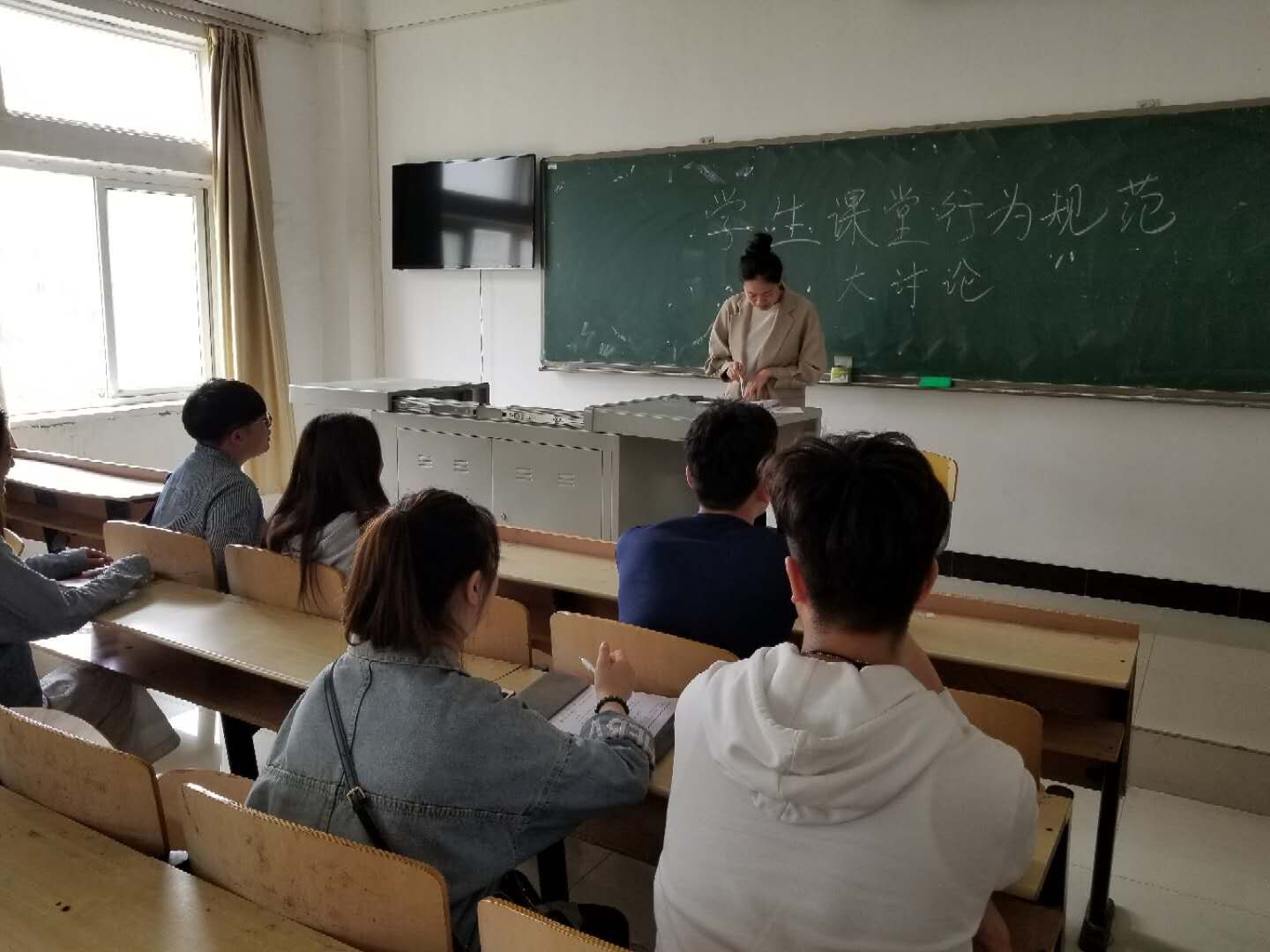 然而2018级的同学们也在此次的活动中围绕了班级学生个人成长与发展、建设班集体优良学风以及尊师重教等问题展开讨论,并邀请班级同学结合自身情况进行了发言,不仅阐述了个人观点,同时也对行为课堂规范条例作出了相应承诺。他们认为作为一名学生,应当尊重老师上课的每一分每一秒,老师备课时间很长就是为了课堂上那45分钟,可是在课堂上无人回应,这会使老师上课的激情也得以湮灭;其次学生应该做到不早退,不旷课,遵守上下课规定的时间,如有特殊情况者应当提前向辅导员履行批假流程。在学生上课之前,应当做好一切关于课上的准备,例如准备好相关资料以及书籍等,并且摆正态度认真完成老师布置的课后作业;总之规范学生课堂行为是我们每位在校学生应有的准则。