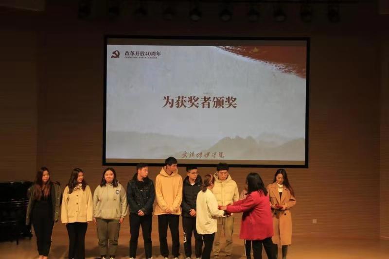 在表彰环节中,首先表彰了优秀征文作品和优秀设计作品获奖同学,由余建军书记为获奖同学颁奖并合影留念。随后,两位优秀设计作品学生代表上台发表获奖感言,同时介绍获奖作品的设计理念。接下来表彰的优秀演讲作品和优秀微电影作品,由宗微校长为获奖同学颁奖并与之合影留念。之后由yl7703永利集团鹿鸣朗诵艺术团朗诵的《老人与海》把现场观众带入到了邓小平先生为改革开放做出巨大贡献以及改革开放40年来的美好回忆中,引起了现场观众的强烈共鸣。最后,参加本次大会的校领导与各学院书记、学工处老师、优秀作品学生代表上台一一合影留念。