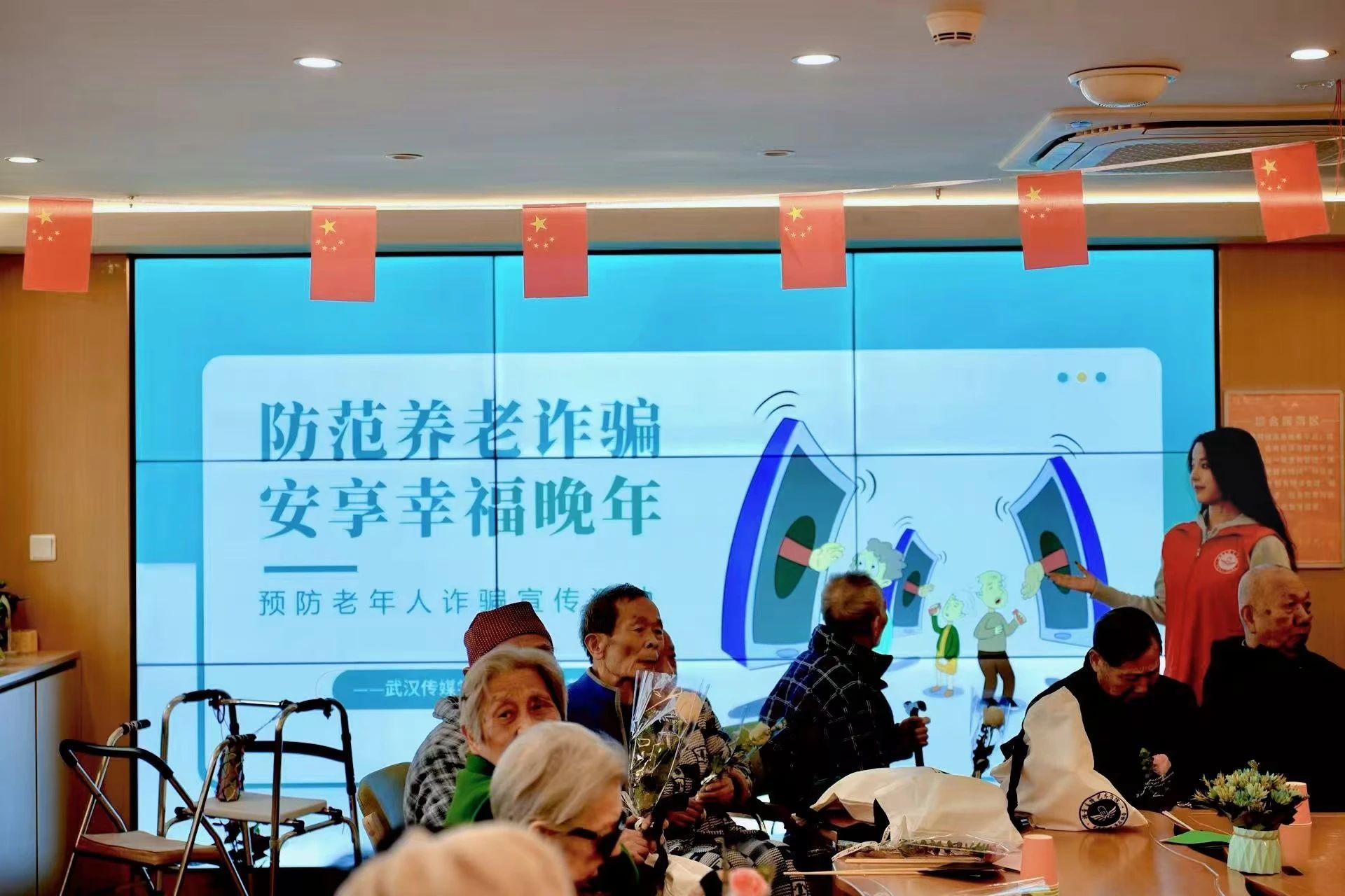 轻松的游戏环节后,颜萱同学带来了防诈骗宣讲。她从典型案例切入,为爷爷奶奶们详细剖析新型诈骗的常见套路与防范要点。