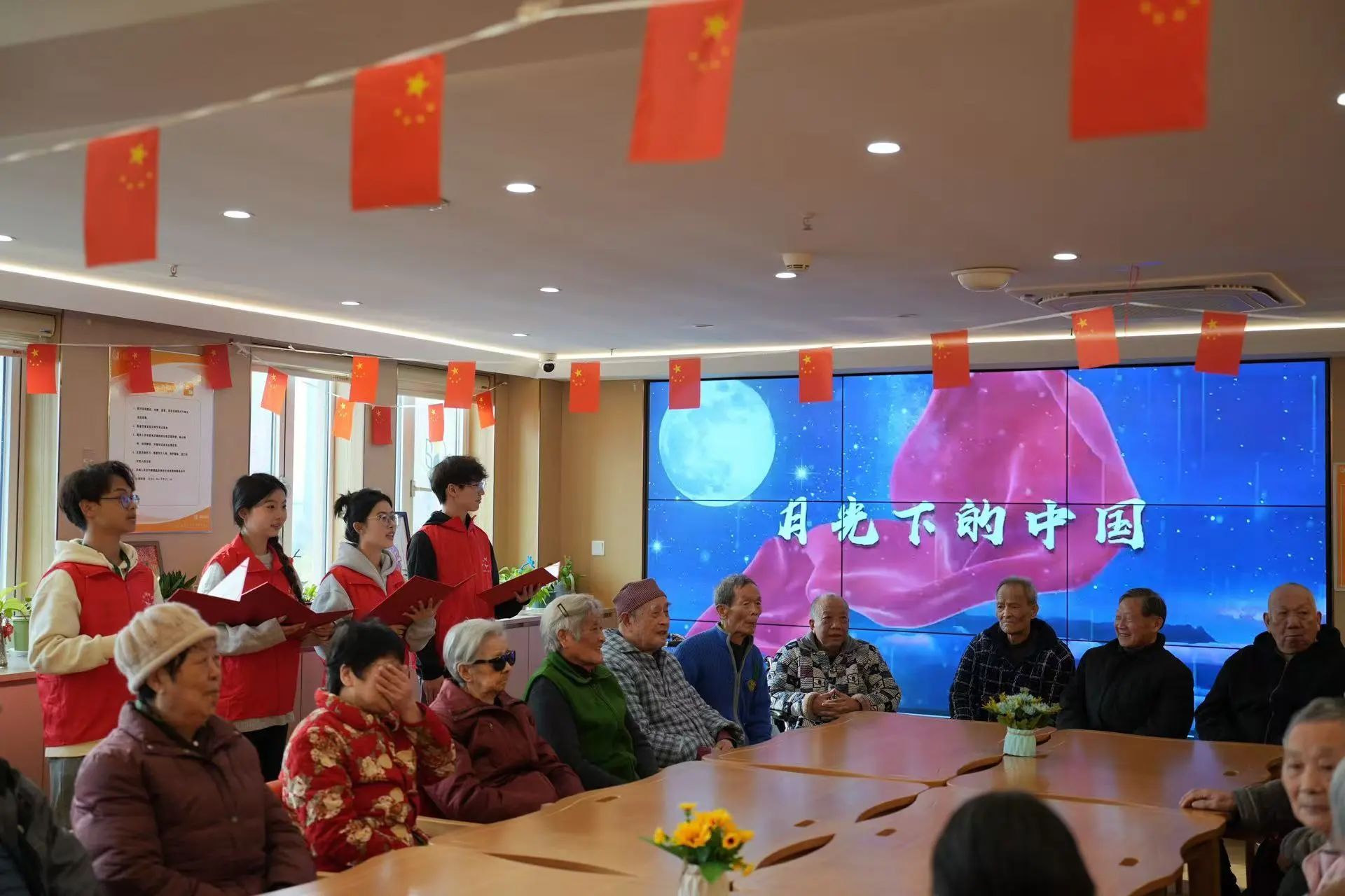 活动开场,任杰、余函恬、刘畅、廖鑫四位同学朗诵《月光下的中国》,以深情的演绎展现了中国在月光下的柔美与厚重,为爷爷奶奶们送去心灵慰藉。