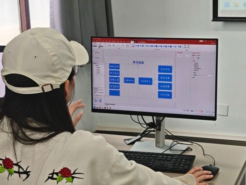 同学们运用学到的PPT核心技巧现场实践制作PPT。在接下来的点评环节中,同学们对照作品圈画笔记,展现了极大的学习热情与实操能力。