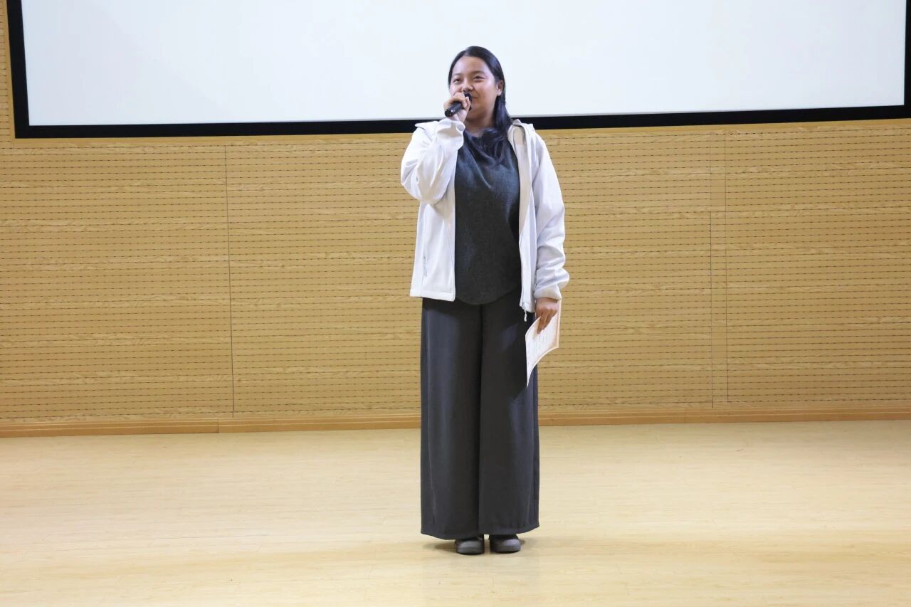 我院第十四届学生会实践部部长边雨璇同学登台分享了在我院团委、学生会两年的温暖经历,感慨团委、学生会如同“大家庭”般让大家感到安心与踏实。她以“于高山之巅方见大河奔涌,于群峰之上更觉长风浩荡”共勉,鼓励同学们永葆干劲与冲劲,勇敢攻克困难、实现目标。