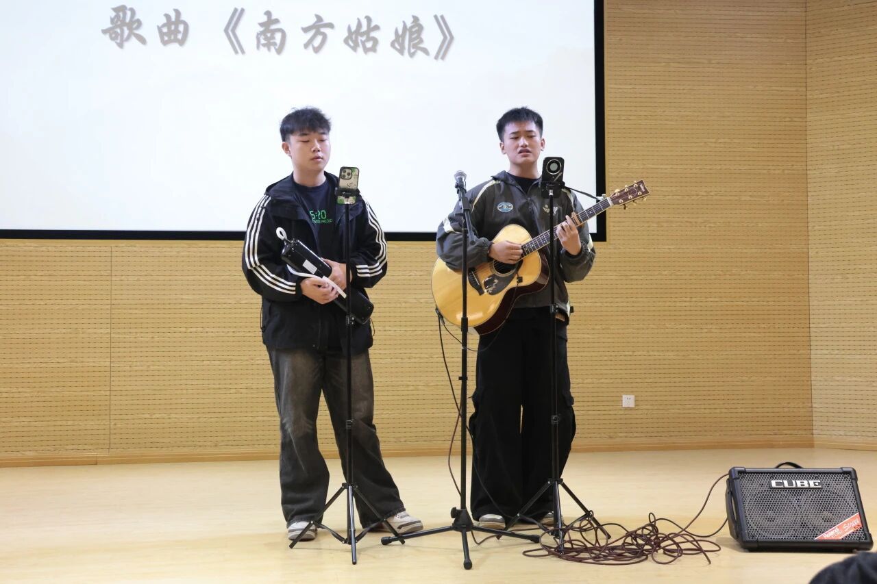 郑好、万晓果同学携手登台,邀请全场同学一同唱响《南方姑娘》。舒缓的旋律伴着整齐的合唱,瞬间让现场浸满温情。