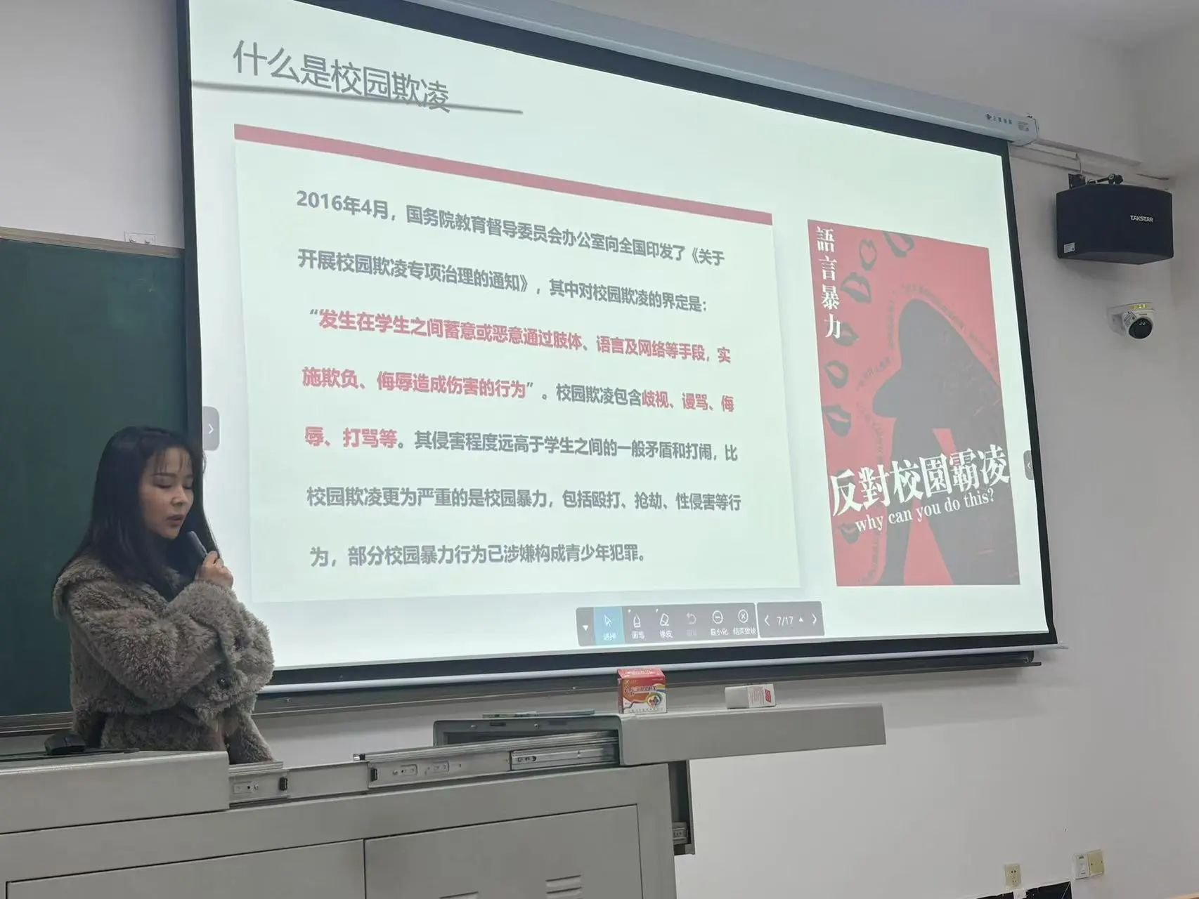 各位辅导员老师结合真实案例,以通俗易懂的语言向同学们讲述了校园欺凌的常见形式,无论是肢体上的推搡殴打,还是言语上的侮辱谩骂、社交关系中的孤立排挤,都让同学们清晰地认识到校园欺凌并非遥远的概念,而是可能就发生在身边。在讲述过程中,老师们还深入剖析了这些行为背后的深层原因,引导同学们思考如何从根源上预防此类事件。