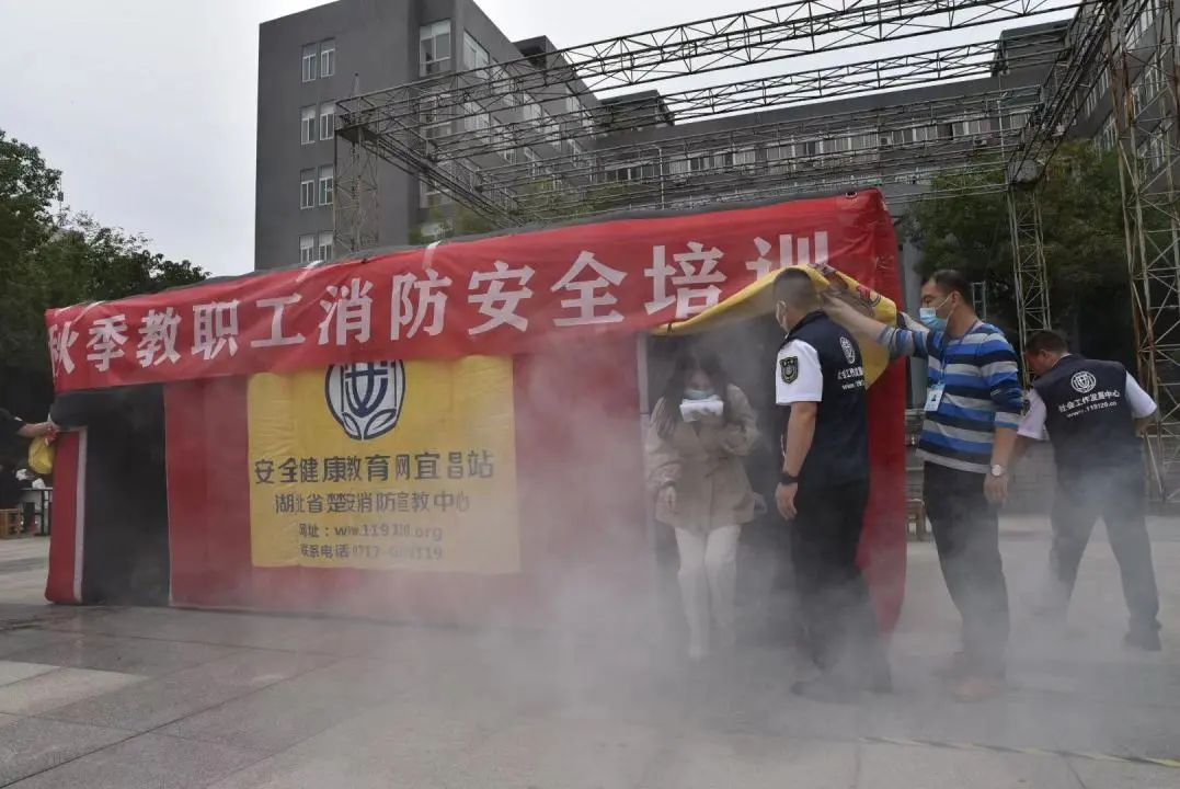 随后yl7703永利集团教职工来到行政楼后广场进行模拟逃生演练活动,从打湿毛巾捂住口鼻低下腰进入烟雾模拟迷宫仓到从出口冲出,通过实践让消防意识进一步走进武传教职工的心中!